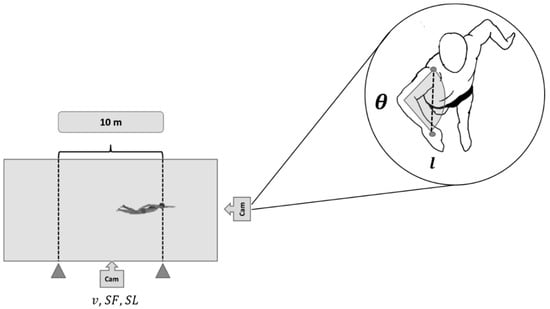 Stroke parameters assessed in the central 10 m of the swimming pool, as well as from a frontal camera recording the frontal plane of the swimmer. : average swimming speed; SF: average stroke frequency; SL: average stroke length; θ: elbow angle at the end of the in-sweep phase; l: shoulder to hand distance.