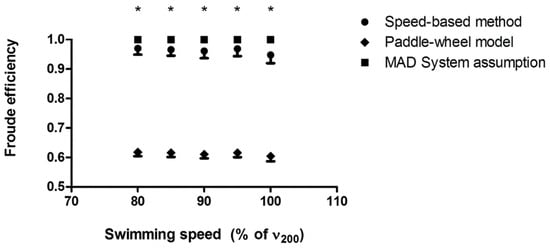 It should be highlighted, however, that despite that all the methods provided significantly different values of , they agreed with each other, and they might be considered as valid methods to measure efficiency, although not interchangeably, as indicated in Figure 4 and Figure 7. The amplitude of the limits of agreement was shorter in the MAD System condition, which is possibly related to the “fixed” values of assumed for this condition, reducing the variability in the averaged efficiency and in the differences between the methods. Furthermore, since speed-based and paddle-wheel were obtained from the same parameters, the variances in obtained from both methods are similar, resulting in shorter limits of agreement when comparing these methods, in both conditions. Especially in the free-swimming condition, the linear regressions provided by the agreement analysis indicated that differences between methods are determined by the magnitude of the averaged efficiency, which means that differences are higher at high-efficiency values (and low swimming speeds) and closer to 0 at lower efficiency values (and higher swimming speeds).