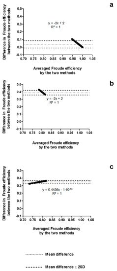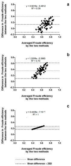The agreement between methods is presented in Figure 4, indicating a short amplitude of the limits of agreement when comparing the speed-based method and the MAD System assumption (between −0.01 and 0.08), the paddle-wheel model and the MAD System assumption (between 0.33 and 0.37), and the paddle-wheel model and the speed-based method (between 0.36 and 0.42). Moreover, the differences seemed to be influenced by the magnitude of the averaged efficiency between the methods (R2 = 1; p < 0.001), as indicated in the linear regression equations of each Bland–Altman plot.
