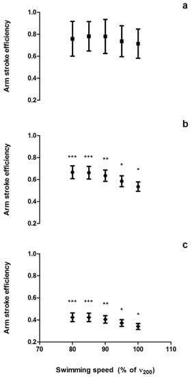 Froude efficiency assessed by the power-based (a), paddle-wheel (b), and speed-based (c) methods at different speeds, during the incremental protocol; *** Different from arm stroke efficiency values at 95 and 100% of (p < 0.05); ** Different from arm stroke efficiency values at 85%, 95%, and 100% of (p < 0.05); * Different from arm stroke efficiency values at all swimming speeds (p < 0.05).