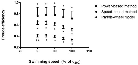 Froude efficiency assessed by the power-based, paddle-wheel, and speed-based methods at different speeds during the incremental protocol; a. All methods are different; b. Difference between the power-based method and the paddle-wheel model; c. Difference between the speed-based method and the paddle-wheel model.