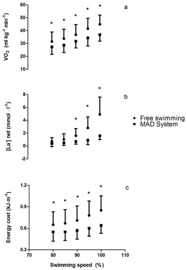 Individual differences in oxygen uptake (a), blood lactate concentration, (b) and energy cost (c) between free-swimming and the MAD System condition for each imposed speed (* p < 0.05).