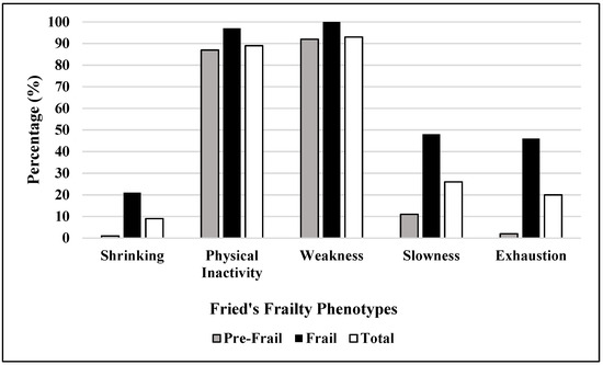 The prevalence of frailty among older adults residing in institutions on the west coast of Peninsular Malaysia was 40.7%, followed by 56.6% and 2.6% for pre-frail and robust older adults, respectively. The determined prevalence is drastically higher when compared to Malaysian community-dwelling older adults, urban (8.9%) and rural (9.7%), although the prevalence of pre-frailty was observed to be similar, urban (61.7%) and rural (57.9%) [31,32]. However, these findings are in agreement with those reported in a systematic review wherein the prevalence of frailty among institutionalised older adults exhibited an average of 52.3%, followed by pre-frailty at 40.2% [10]. It can be inferred that older adults residing in institutions have lower health outcomes and are not as active as those who are community dwelling; hence, they are more likely to be frail [33].