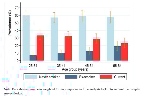 We limited our analysis to men because of the low prevalence of smoking among adult women (1%). The analytical sample consisted of 1766 men with valid information on current smoking status. We report the prevalence of smoking in men in the form of proportions with corresponding 95% confidence intervals (95% CI). The prevalence estimates are weighted and adjusted for the complex survey design, including adjustment for non-response. We ran age-adjusted bivariate and fully-adjusted multivariate logistic regression models to identify factors associated with current smoking, comparing current smokers with those not currently smoking (never and ex-smokers). We also ran multinomial logistic regression analysis on smoking with three categories: never smoking, ex-smoking and current smoking, using never smoking as the reference group. Age-adjusted (aOR) and fully-adjusted odds ratios (AOR) with corresponding 95% CI are reported for the analysis of smoking using two categories, while age-adjusted (aRRR) and fully adjusted relative risk ratios (ARRR) are reported in the multinomial logistic regression models (smoking status represented by the three categories listed above). All analyses were weighted for non-response and adjusted for the complex survey design, using Stata V.15.0 (StataCorp LP, College Station, Texas, USA).