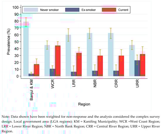 The prevalence of smoking was significantly higher in semi-urban and rural areas compared with urban areas. The prevalence of both current and ex-smoking were lowest in Banjul (the capital city) and Kanifing Municipality when we used region of residence (LGA) to distinguish between degrees of urbanicity (Figure 2). Both current and ex-smoking were significantly higher among the more physically active participants compared with the less active participants (see Table S1). However, this finding could be age-related as younger men were more physically active. The prevalence of current smoking was significantly higher among the underweight (47%, 95% CI: 39.0–54.8) and those with a normal weight (36%, 31.6–41.1) compared with the overweight (24%, 18.8–29.6) and the obese (24%, 15.7–33.8) (Table S1).
