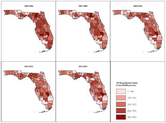 We used county-level state-wide data to investigate the spatial patterns and temporal trends of MI hospitalization risks at the county-level in Florida over a 10-year period to identify communities with consistently high MI burdens, so they may be prioritized for intervention to reduce health disparities.