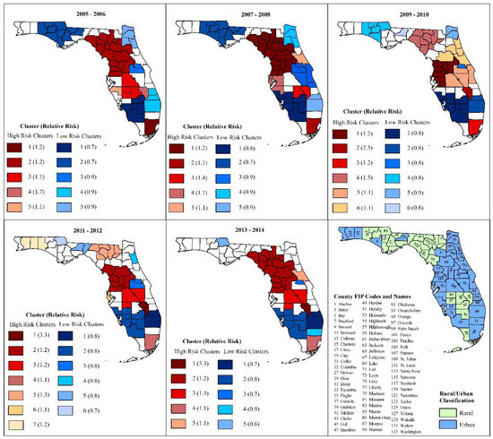 Figure 3 also shows that four low- and 3–4 high-risk clusters were observed from the beginning to the end of the study period, with 85.7% of southern Florida low-risk counties and 88% of high-risk counties in 2005–2006 retaining their status in 2013–2014. Large, persistently occurring high-risk clusters were located in Southeast Florida (13% of population) and in predominantly rural counties in the Big Bend area (11% of total population) (Table 3). Smaller persistently high-risk clusters, comprising less than 5% of the state’s population, were located in rural counties in South Central Florida. Persistently low-risk clusters comprised 5%–8% of the state’s population, and they were located in primarily coastal urban counties designated as retirement designations in Southeast and Southwest Florida (Table 4).