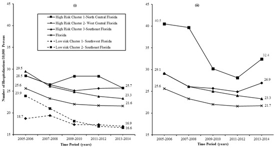 The low-risk cluster in Southwest Florida had the lowest MI hospitalization risks (Figure 5). Therefore, MI hospitalization risks for this cluster were used as the baseline/reference for assessing changes in health disparities between circular high- and low-risk clusters during the 2013–2014 time period compared to the 2005–2006 time period.