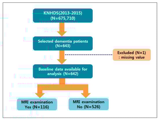 The prevalence of dementia is increasing worldwide and is predicted to double every 20 years []. Dementia not only adversely affects the quality of life of patients but also leads to a costly burden of disease. As concern about dementia increases, interest in neuroimaging examination of patients whose cognitive function is decreasing is also rising. Brain Magnetic Resonance Imaging (MRI) examination has been used to detect lesions, such as brain atrophy, white matter lesion, cerebral hemorrhage, and latent cerebral infarction. However, MRI techniques have been developed recently for more than the detection of organic lesions. MRI utilization is increasingly used for diagnostic purposes, such as early diagnosis of dementia and special examination of dementia []. Dementia is the most representative senile disorder, and it requires a variety of medical services. According to earlier studies, most dementia patients have two or more comorbid conditions []. Comorbidity is defined as a clinical condition that exists at the time of the event that may affect the outcome of the study []. The Charlson Comorbidity Index (CCI) generates a total score that is weighted based on the presence of various conditions to account for different comorbidity and is commonly used in findings and mortality studies []. Comorbid conditions are more likely to affect the severity of dementia, as well as the socioeconomic burden and complexity of care []. According to a literature review, it was found that there is a difference in medical service use depending on comorbidities and the residence area of the dementia patient, and if patients with dementia have a higher CCI, they preferred large size hospitals with various care departments []. Since dementia patients have to consult with multiple specialists over extended time periods, the diagnostic workup of dementia is more difficult for rural patients []. As a result of the Korea Institute for Health and Social Affairs Research, the most common chronic disease for people with dementia is hypertension. The most common causes of death for patients with dementia were death due to cardiovascular disease, followed by respiratory disease and nervous system disease []. DeKosky [] has suggested that diagnosis, treatment, and follow-up of dementia patients from the earliest possible stage will reduce health care costs, increase the quality of life for patients, and reduce family burden. Therefore, it is important that comorbid conditions are managed appropriately and there is effective diagnosis of dementia patients. MRI examination is useful not only for diagnosis of dementia but also for diagnosis of asymptomatic cerebral infarction. Asymptomatic cerebral infarction is known to exhibit a higher frequency in stroke and dementia patients; therefore, MRI examination of dementia patients can be extremely useful for the early detection of cerebral infarction [,]. Research on patients with dementia to analyze the effectiveness of an MRI diagnosis has recently been undertaken, but there is a lack of research on MRI diagnosis by comorbid condition of patients with dementia. To obtain more accurate data from MRI examination of patients with dementia, it is necessary to perform studies in which comorbid conditions are considered [,].