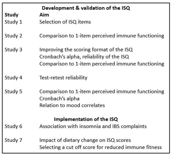 The self-assessment of perceived immune status is important, as this subjective observation leads individuals to decide whether or not to seek medical help or adapt their lifestyle. In addition, it can be used in clinical settings and research. The aim of this series of studies was to develop and validate a short questionnaire to assess perceived immune functioning. Five surveys were conducted among Dutch and International young healthy adults (18–30 years old), and two others among older age groups with various health complaints. For the first study, an existing immune functioning scale was modified and elaborated resulting in 23 immune-health-related items, of which the occurrence was rated on a 5-point Likert scale. A student sample was surveyed, and the results were used to shorten the 23-item listing into a 7-item scale with a predictive validity of 85%. Items include “sudden high fever”, “diarrhea”, “headache”, “skin problems (e.g., acne and eczema)”, “muscle and joint pain”, “common cold” and “coughing”. The scale is named Immune Status Questionnaire (ISQ), and it aims to assess perceived immune status over the preceding year. The second study revealed that the ISQ score correlated significantly with a 1-item perceived immune functioning (r = 0.383, p < 0.0001). In the third study, the final Likert scale descriptors were determined (“never”, “sometimes”, “regularly”, “often” and “(almost) always)”. The fourth study showed that the test–retest reliability of the ISQ is acceptable (r = 0.80). The fifth study demonstrated the association of ISQ scores with various neuropsychological and health correlates in an international sample, including perceived health and immune fitness, as well as levels of stress, fatigue, depression and anxiety. Study 6 demonstrated significant associations between ISQ scores and experiencing irritable bowel syndrome (IBS) symptoms in a sample of insomnia patients. Study 7 compared the effect of a dietary intervention in participants reporting “poor health” versus “normal health”. It is shown that ISQ scores can differentiate between those with poor and normal health, and that an effective intervention is associated with a significant improvement in ISQ scores. Data from Study 7 were further used to determine an ISQ cut-off value for reduced immune functioning, and a direct comparison with 1-item perceived immune functioning scores enabled constructing the final scoring format of the ISQ. In conclusion, the ISQ has appropriate face, content, and construct validity and is a reliable, stable and valid method to assess the past 12 month’s perceived immune status.