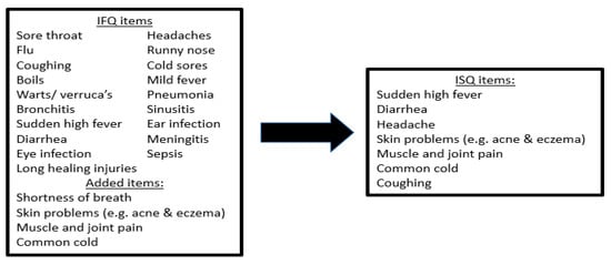 The Immune Fitness Questionnaire (IFQ) [23] served as the basis for developing the Immune Status Questionnaire (ISQ). The IFQ does provide information about the underlying cause as it includes multiple items. A study introducing the IFQ revealed significant associations of IFQ scores with the number of general physician visits, general health and experiencing problematic internet use [23]. Although it has not been used in clinical practice, our group used the IFQ in two of our studies [19,22]. This led to the identification of certain shortcomings. Specifically, the IFQ does not capture some of the common aspects of a compromised immune function, such as muscle and joint pain or the common cold. On the other hand, it does include some relatively less common items, such as meningitis, slow healing wounds and boils.