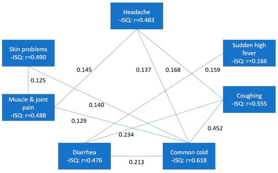 It is evident from Figure 3 that all individual items are highly and significantly correlated (r > 0.4 in all cases) with the total ISQ score. In contrast, the correlations between the single ISQ items are low (around r = 0.1) and often not statistically significant, with the exception of coughing and the common cold.
