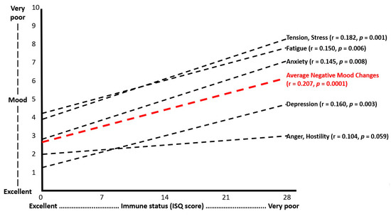 Immune status was assessed with the immune status questionnaire (ISQ). An average “negative mood changes score” was computed by averaging the scores on the 5 mood scales. Spearman’s rho correlations (r) were considered statistically significant if p < 0.05.