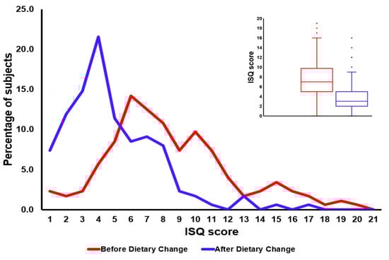 The distribution of ISQ scores before and after the dietary change to consume raw fermented milk (RFM) products. A leftward shift of the distribution indicates improved immune fitness after the dietary change. The right top box plot figure shows the minimum, first quartile (Q1), median, third quartile (Q3) and maximum ISQ scores obtained before and after the dietary change. A significant reduction (p < 0.0001) in mean ISQ scores was found after the dietary change, suggesting improved immune fitness (discussed in detail elsewhere [26]).
