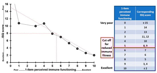 Comparison of ISQ and 1−item perceived immune functioning scores. ISQ and 1−item perceived immune functioning ratings were covering the same time period. The best fitting line through the data points is used to determine a cut off point for reduced immune functioning.