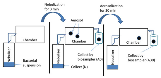 A schematic diagram of the setup and different sampling points. The bacterial suspension collected was called N. After completing the nebulization process, the aerosols were collected as A0, and the time was set as zero. Bioaerosols were suspended in the air for 30 min before sampling as A30. This schematic diagram was adopted from our previous study [20].