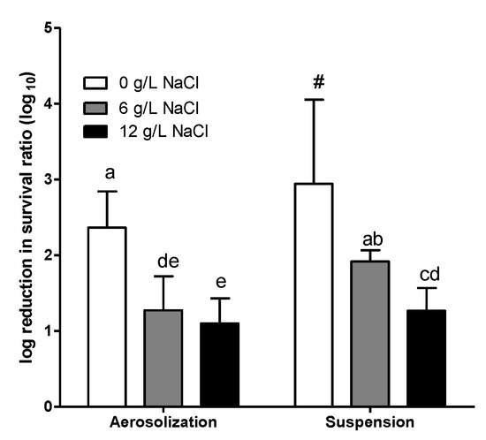 In brief, an increase in NaCl concentration in the synthetic wastewater medium reduced the log reduction of survival for both aerosolization and airborne suspension. On the other hand, the E. coli showed a higher reduction in survival when it grew at pH 6.