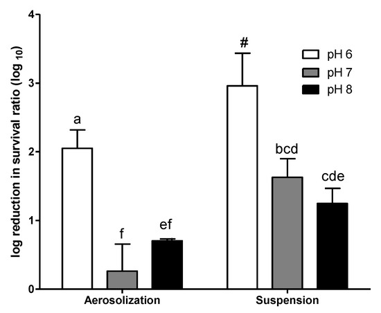 The E. coli showed a higher reduction in survival when it grew at pH 6 (Figure 3). No significant difference in log survival was observed for E. coli grown at pH 7 and pH 8 for either aerosolization or airborne suspension. The log reduction of survival during aerosolization (2.05) and suspension (>2.97, and the acute value may have been even higher, as no airborne bacterial survival could be detected at A30) for E. coli grown at pH 6 was remarkably higher that those grown at pH 7 and pH 8.