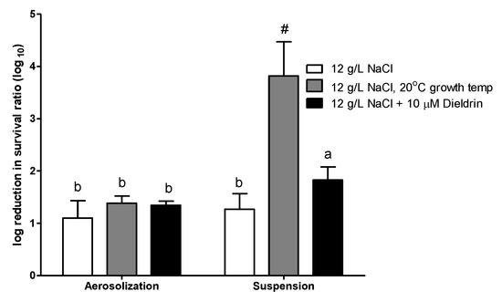 E. coli cultured at a lower temperature (20 °C) or with the addition of 10 μM Dieldrin in the synthetic wastewater medium showed no significant effects on the airborne survival of E. coli during aerosolization. However, the log reduction in survival was higher during suspension.