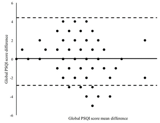 Bland–Altman dispersion plot of the mean PSQI global score (n = 106). PSQI: Pittsburgh Sleep Quality Index.