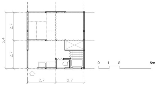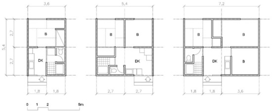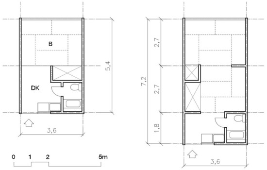 Two models were offered: one bedroom with 20 m2 and two bedrooms with 26 m2. All the houses were equipped with a prefabricated bathroom and a small kitchen. The rooms were sized using tatami mats (0.9 × 1.8 m), which determined the depth of the room—2.7 m—and the house’s total width—3.6 m (see Figure 1).