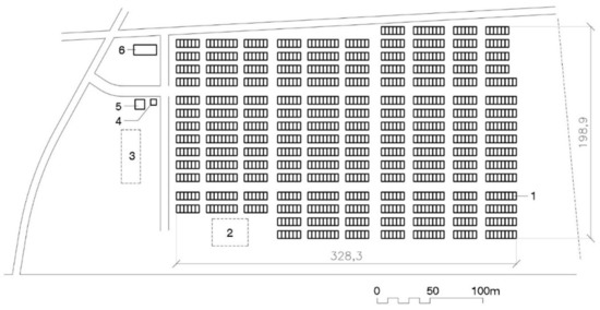 Plan of Kobe’s 1000 THA. 1—Temporary housing row; 2—Playground; 3—Plantation; 4—Nursery; 5—Community Center; 6—Contact Center [39].