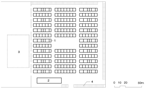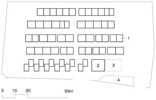 Plan of Tohoku’s 233 THA. 1—Temporary housing row; 2—Community Center; 3—Playground; 4—Parking area [48].