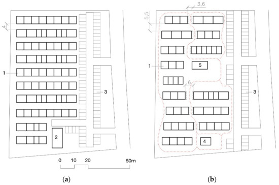 The THAs were much smaller than in Kobe, from 20 to 250 TH modules ([40], p. 73). The surface size per house in these camps was kept at 100 m2. Layout was very similar to Kobe’s with matrices of rows facing the same direction, this time with fewer units, two to six. Community centers were included, one for every 50 THs [29,30], which were placed at the entry to the THAs next to the parking lot (see Figure 4).