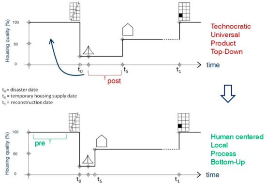 The purpose of temporary solutions is to support victims during the recovery period [4]. However, unlike temporary or emergency shelter, focused on providing shelter for the period immediately after the catastrophe and when life is interrupted, TH allows inhabitants to return to their domestic responsibilities and daily routines [5]. When people lose their houses, they lose more than just a place to live. They also lose their privacy, their identity, and even the recognition of their dignity as people [6]. TH are not deployed just to decrease the vulnerability of the victims to disease, health problems or future disastrous events but to provide a space able to guarantee appropriate conditions of protection, habitability, dignity, and privacy [7]. Temporary housing is a determining factor in recovery. It is a support for family and community life enabling people to make a living, maintain families, and move and communicate freely [8]. While the victims lack safe and decent housing, recovery work cannot be done efficiently [9], which will feed back into a worsening of the social and economic impact of the disaster [4,10]. Having appropriate housing is a first step towards creating a certain sense of normalcy in the life of affected communities [11].