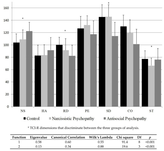 Means, standard deviations and ranges were calculated for continuous variables while frequencies and percentages were calculated for categorical variables. Contingency table Chi-square tests were used to test differences among groups for categorical variables and univariate ANOVAs while Bonferroni tests were applied for continuous variables. A multiple, stepwise discriminant analysis was performed to evaluate the optimal combination of the temperament and character dimensions that are able to discriminate between individuals with psychopathy with predominant antisocial or predominant narcissistic personality traits and a control group. The probability value (p) of <0.05 was chosen as the level of statistical significance for all tests. All analyses were performed using IBM SPSS 21.0.