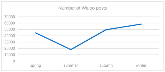 Using web crawlers, we searched the original Weibo published by Weibo users from 1 January 2018 to 31 December 2018 based on two keywords, namely, “haze” and “PM2.5”, and saved the crawled blog data to a local server as our main data source. Then, we cleaned the data by deleting duplicate content and advertisement. In addition, we divided the data for the entire whole year into four seasons, i.e., spring (March, April, and May), summer (June, July, and August), autumn (September, October, and November), and winter (December, January, and February). The trend of the public’s environmental perception of haze weather was studied on the basis of the four seasons. The number of microblog posts in different seasons is shown in Figure 1.