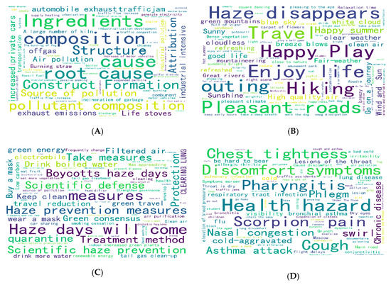 Figure 2D reflects the prominent frequency of keywords such as health risks, discomfort symptoms, pharyngitis, sore throat, and chest tightness. Winter is generally the high season of haze, and the public generally have a series of uncomfortable physiological reactions due to the influence of haze. It was clear that in winter the public was greatly affected by haze and had a strong reaction.