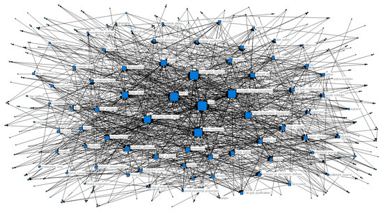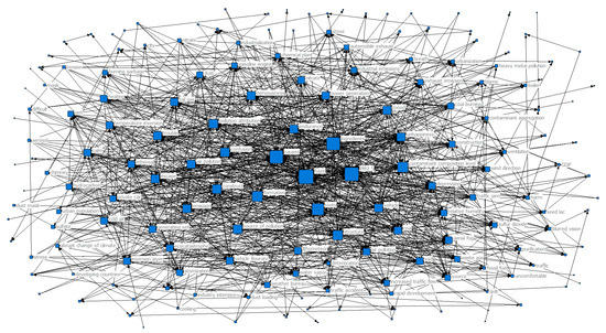 The connection between two keywords represented their co-occurrence relationship. The closer the connection was, the more times the two keywords co-occurred with one another. The higher the co-occurrence frequency, the stronger the correlation between words, and the greater the edge weight between nodes. To characterize the local information of a node, we introduced node strength, which was defined as: