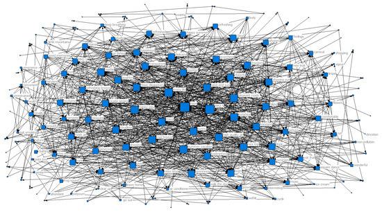 In order to further explore the trend of the public’s perception and how it changed with the seasons during haze weather, we designed a co-occurrence matrix representing the perceptual keywords and generated a perceptual keyword co-occurrence network map for each season, as shown in Figure 3, Figure 4, Figure 5 and Figure 6. Each network node represented a perceptual keyword. The size of the node represented the degree of the node in the network where the node was located, that is, the degree of co-occurrence of the node with other nodes (keywords). The larger the node, the higher the degree of co-occurrence.