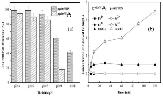 Performance of MB degradation in pyrite/H2O2 and pyrite/PDS system were both obtained under 0.5 g/L pyrite, 2 mmol/L oxidant and different desired initial pH. We compared the removal efficiency between the pyrite/PDS and the pyrite/H2O2 (Figure 1a). The results showed that the removal efficiencies were similar whether an acidic condition or neutral condition (more than 90%). When the initial pH was 9, the removal efficiency of pyrite/PDS was 61%, whereas that of pyrite/H2O2 was decreased sharply to 18%, additionally, when the initial pH was 11, there was no MB removal in pyrite/H2O2 process, while the removal efficiency of pyrite/PDS still reached 42%.