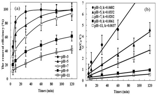 The pH is the main factor significantly influencing the degradation performance. To evaluate thoroughly the effect of the initial pH, batch experiments with different initial pH (3, 5, 7, 9, and 11) were set up by adding suitable materials. As shown in Figure 2a, the removal efficiency was 99% after 60 min when the initial pH was 3 whereas it reached more than 90% after 120 minutes under neutral condition. Meanwhile, the removal efficiency was decreased with the increased initial pH under alkaline condition. It was 61% when the initial pH was 9 and it was 42% when the initial pH was 11. Figure 2b shows that the kobs decreased from 0.0682 min−1 to 0.0332 min−1 with an increase initial pH from 3 to 5, then the values began to decrease sharply with the continuous increase initial pH (from 0.0332 min−1 to 0.0037 min−1).