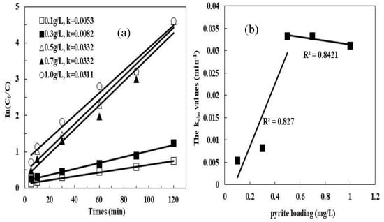 Effect of the loading of catalysts on the MB degradation by pyrite/PDS process: (a) In(C0/C); (b) change of kinetic rate constants with respect to pyrite loading. Experimental conditions: [MB]0 = 100 mg/L, [PDS] = 2 mmol/L, initial pH = 5, 25 °C.