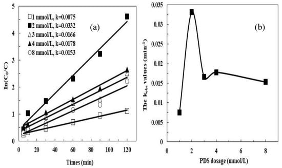 Figure 4 shows the effect of the initial PDS concentration on the removal of MB. When the initial PDS was 1 mmol/L, the kobs was 0.0075 min–1 after 120 min, but at an initial PDS concentration of 2 mmol/L, the kobs increased to 0.0332 min–1. However, when the initial PDS concentration increased to 8 mmol/L, the kobs value decreased to 0.0153 min–1. These variations were consistent with those observed in previous studies, which proposed that when an appropriate concentration of Fe2+ was provided in the reaction system, an increase of the PDS concentration can enhance the oxidative degradation of organics due to the improvement in SO4•− formation. In contrast, an excessive amount of PDS readily reacts with generated SO4•− (Equation (16)) [32]: