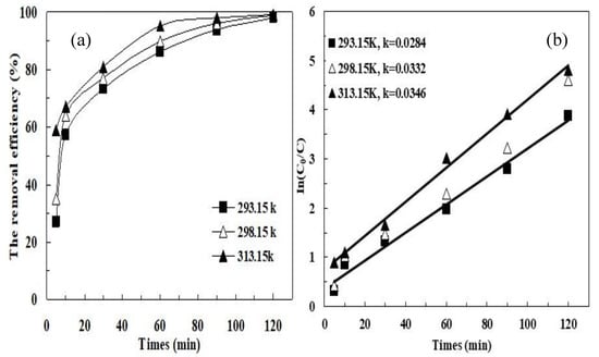 Effect of reaction temperature on the MB removal by the pyrite/PDS process:(a) the removal efficiency; (b) In(C0/C). Experimental conditions: [MB]0 = 100 mg/L, [pyrite] = 0.5 g/L, [PDS] = 2 mmol/L, initial pH = 5.