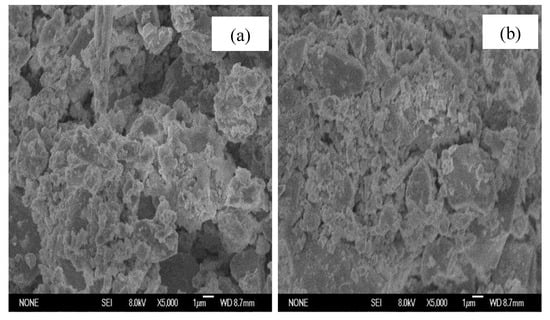 The SEM of the pyrite: (a) the natural pyrite; (b) the pyrite after reaction. Experimental conditions: [MB]0 = 100 mg/L, [pyrite] = 0.5 g/L, [PDS] = 2 mmol/L, initial pH = 5, 25 °C.