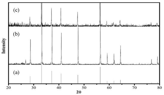 Comparison of XRD of pyrite in different periods: (a) pyrite standard card (FeS2-PDF#89-3057); (b) the initial pyrite; (c) the pyrite after reaction. (Experimental conditions: [MB]0 = 100 mg/L, [pyrite] = 0.5 g/L, [PDS] = 2 mmol/L, initial pH = 5, 25 °C).