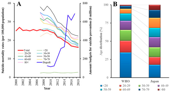 (A) Trends of age-dependent Japanese suicide mortality rates and government budgets for comprehensive suicide prevention programmes. Left and right ordinates indicate suicide mortality rate (per 100,000 population/year) and budget amounts ($million/year), respectively. (B) Comparison of age-distribution between World Health Organisation (WHO) world standard population model and Japan. Ordinate indicates age-distribution rates (%). Japanese age distribution was significantly different from WHO world standard population model by Mantel–Haenszel test (χ2 = 52.1, p < 0.05).