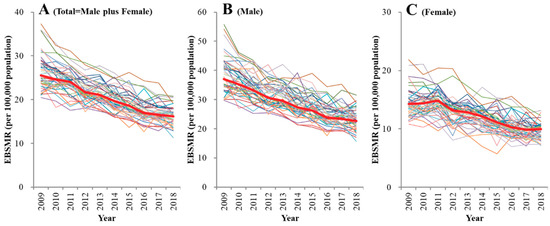 Trends of empirical Bayes standardized mobile ratio (EBSMR) of suicide mortality per 100,000 population between 2009 and 2018 for (A) total (male plus female), (B) males and (C) females in 47 Japanese prefectures, and national average (red). Ordinates: EBSMR of suicide mortality for each prefecture (per 100,000 population); abscissa: time (year).