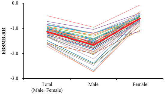 Time-dependent reduction trends of total EBSMR of suicide mortality (EBSMR-RR) for all 47 prefectures are mean ± SD = −1.15 ± 0.26 and median = −1.13 (Figure 3). The EBSMR-RR of males for all 47 prefectures are mean ± SD = −1.74 ± 0.43 and median = −1.63 (Figure 3). The EBSMR-RR of females for all 47 prefectures are mean ± SD = −0.61 ± 0.18 and median = −0.62 (Figure 3). Therefore, the EBSMR of total, male, and female suicide mortality decreased 1.15, 1.74, and 0.61 per year, respectively.
