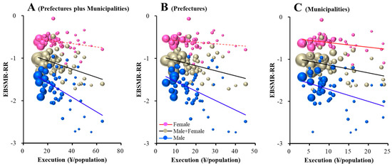 Relationship between EBSMR-RR and regional execution amounts (REAs) in 47 prefectures: (A) prefectures plus municipalities, (B) prefectures and (C) municipalities. Ordinates indicate EBSMR-RR and abscissas indicate REAs (¥ per population). Sphere size indicates the population size of each prefecture. Brown, blue and red indicate EBSMR-RR of total (male plus female), male and female, respectively. Linear regression analysis indicates total EBSMR-RR = −0.010 × REA (prefectures plus municipalities) − 0.866, = −0.012 × REA (prefectures) − 0.932, and = −0.018 × REA (municipalities) − 0.987. Male EBSMR-RR = −0.017 × REA (prefectures plus municipalities) − 1.231, = −0.022 × REA (prefectures) − 1.321, and = −0.028 × REA (municipalities) − 1.432. Female EBSMR-RR = −0.011 × REA (municipalities) − 0.498.