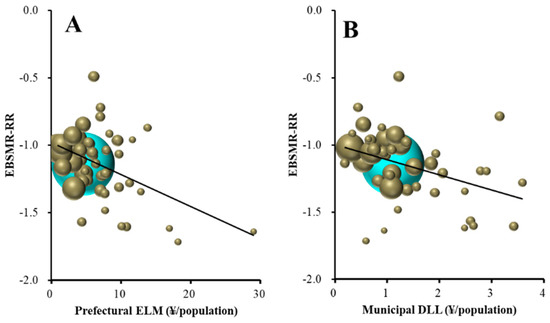 Relationship between total (male plus female) EBSMR-RR and sub-divisions of REAs: (A) prefectural enlightenment programmes and (B) municipal development programmes of leaders and listeners. Ordinates indicate total EBSMR-RR and abscissas indicate sub-divisions of REAs (¥ per population). Sphere size indicates the population size of each prefecture. Light blue spheres indicate the population size of the nation. Total EBSMR-RR = −0.021 × (prefectural ELM) − 0.092 × (municipal DLL) − 0.873. There was no multicollinearity.