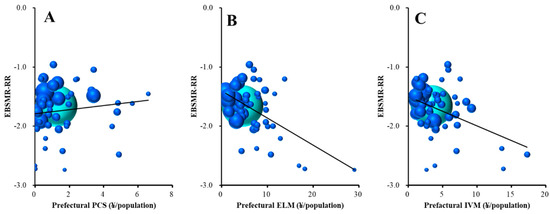 Relationship between male EBSMR-RR and sub-divisions of REAs: (A) prefectural personal consultation support programmes, (B) enlightenment programmes, and (C) intervention model programmes. Ordinates indicate male EBSMR-RR and abscissas indicate sub-divisions of REAs (¥ per population). Sphere size indicates the population size of each prefecture. Light blue spheres indicate the population size of the nation. Male EBSMR-RR = +0.065 × (prefectural PCS) − 0.043 × (prefectural ELM) − 0.039 × (prefectural IVM) − 1.347. There was no multicollinearity.