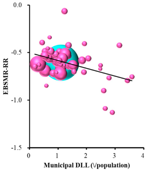 Relationship between female EBSMR-RR and ELM sub-division of REAs. Ordinate indicates female EBSMR-RR and abscissa indicates sub-division of REAs (¥ per population). Sphere size indicates the population size of each prefecture. Light blue spheres indicate the population size of the nation. Female EBSMR-RR = −0.083 × (municipal DLL) − 0.500. There was no multicollinearity.