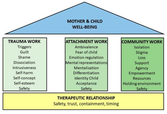 Three aims of treatment were identified by clinicians: (1) building a secure attachment between mother and child, (2) the reduction of post-traumatic stress and trauma-related symptomatology, and (3) addressing stigmatization.