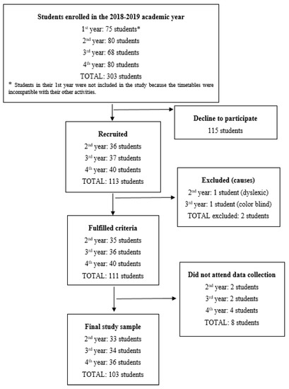 This study included all university students enrolled in the 2018–2019 academic year at the Faculty of Nursing of the University of Cantabria (Spain), aged between 18 and 30 years. The exclusion criteria were: (1) A history of severe traumatic brain injuries; (2) neurological and/or psychiatric diseases; (3) dyslexia; (4) color blindness; (5) students with limited Spanish proficiency; and (6) other sensory deficits.